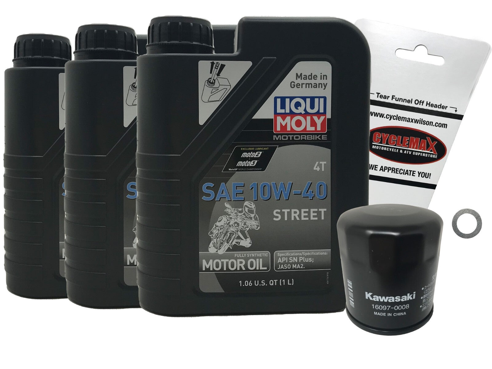 This Oil Change Kit includes Three Quarts of Genuine Liqui Moly Synthetic 10W-40 Oil, One Genuine Suzuki Oil Filter, One Crush Washer, and a Convenient Disposable Funnel