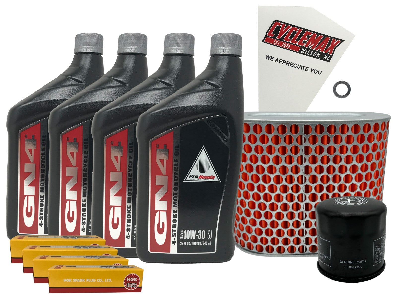 - CYCLEMAX OIL CHANGE KIT INCLUDES: Four Honda 08C35-A131M02 GN4 10W30 Quarts of Oil, One Honda 15410-MFJ-D02 Oil Filter, One Honda 17215-MM8-020 Air Filter, Four DPR7EA9 NGK Spark Plugs, One 14mm Drain Plug Crush Washer and a Convenient Disposable Funnel.