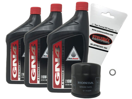This Oil Change Kit Includes Three Quarts of Genuine Honda GN4 10W-40 Motor Oil, One Genuine Honda OEM Oil Filter, One Crush Washer, and a Convenient Disposable Funnel