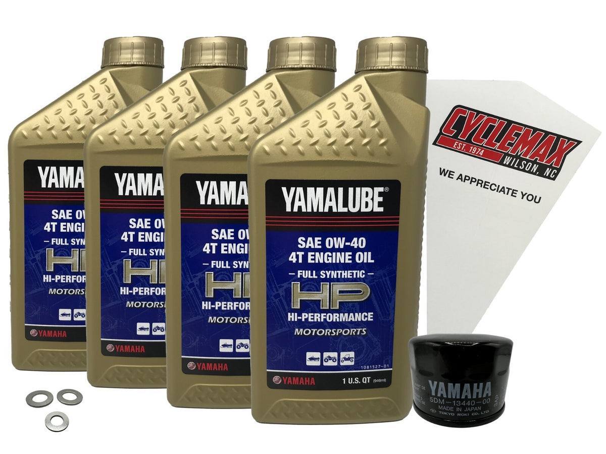 - CYCLEMAX OIL CHANGE KIT INCLUDES: Four Yamaha LUB-00W40-FS-12 Yamalube Full Synthetic 0W40 Quarts of Oil, One Yamaha 5DM-13440-00-00 Oil Filter, Two 6mm Drain Plug Crush Washers, One 10mm Drain Plug Crush Washer and a Convenient Disposable Funnel.