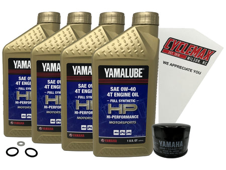 - CYCLEMAX OIL CHANGE KIT INCLUDES: Four Yamaha LUB-00W40-FS-12 Yamalube Full Synthetic 0W40 Quarts of Oil, One Yamaha 5DM-13440-00-00 Oil Filter, Two Yamaha 8JP-RAF05-00-00 Oil Tank O-Rings, One 6mm Drain Plug Crush Washer and a Convenient Disposable Funnel.