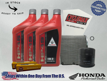 - CYCLEMAX OIL CHANGE KIT INCLUDES: Three Honda 08C35-SYN HP4s Full Synthetic 10W30 Quarts of Oil, One Honda 15410-MFJ-D02 Oil Filter, One Honda 17211-MKP-J00 Air Filter, TwoCPR8EA-9 NGK Spark Plugs, One 12mm Drain Plug Crush Washer and a Convenient Disposable Funnel.