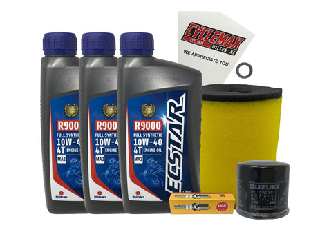 - CYCLEMAX OIL CHANGE KIT INCLUDES: Three Suzuki 990A0-01E40-01Q ECSTAR R9000 10W40 Quarts of Oil, One Suzuki 16510-07J00 Oil Filter, One Suzuki 13780-07G00 Air Filter, One CR6E NGK Spark Plug, One 12mm Drain Plug Crush Washer and a Convenient Disposable Funnel.