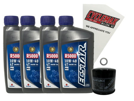 - CYCLEMAX OIL CHANGE KIT INCLUDES: Four Suzuki 990A0-01E10-01Q ECSTAR R5000 10W40 Quarts of Oil, One Suzuki 16510-07J00 Oil Filter, One 12mm Drain Plug Crush Washer and a Convenient Disposable Funnel.