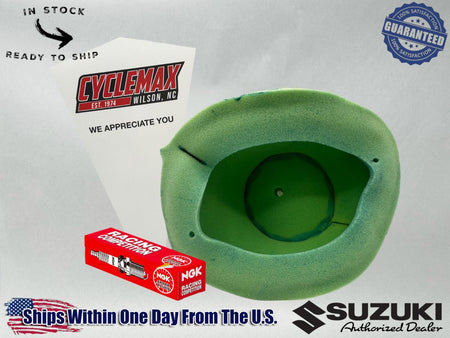 - CYCLEMAX 2-STROKE MAINTENANCE KIT INCLUDES: One Suzuki 13780-36E20 Air Filter, One R6918B-8 NGK Spark Plug, One 12mm Drain Plug Crush Washer and a Convenient Disposable Funnel.