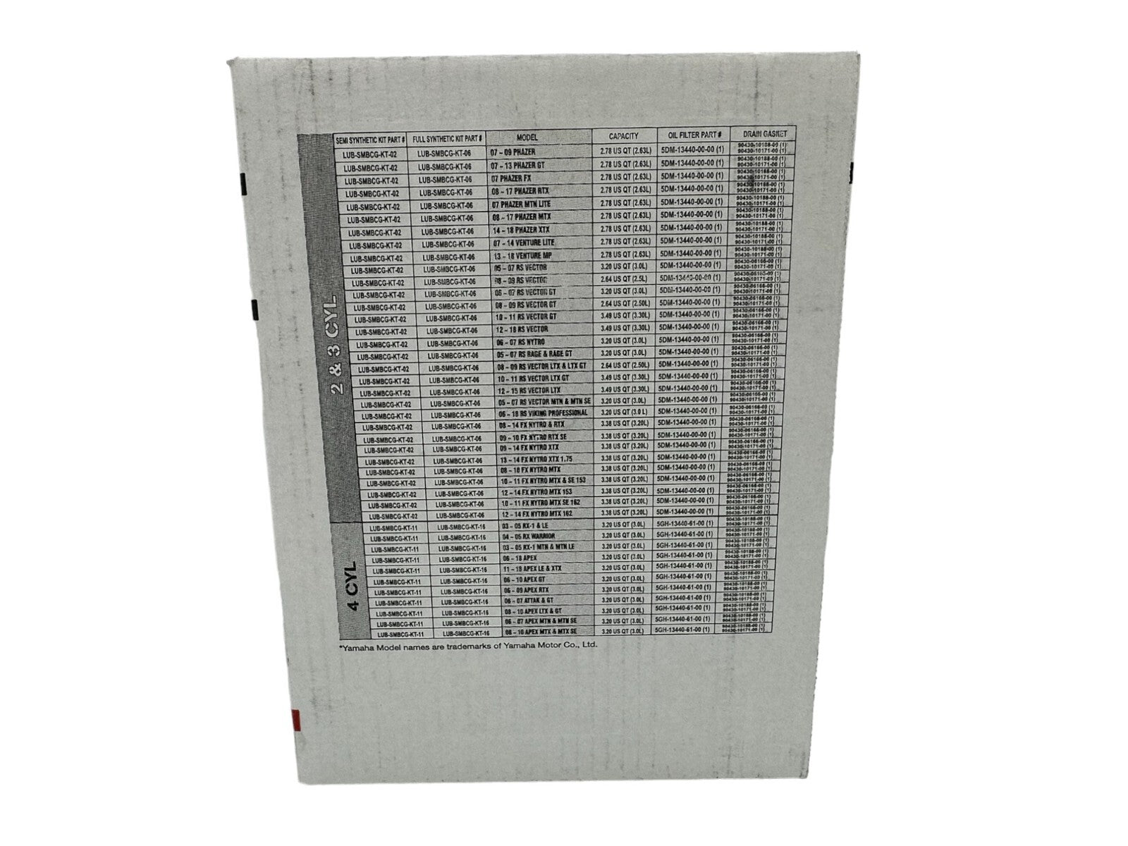 - CYCLEMAX OIL CHANGE KIT INCLUDES: Four Yamaha LUB-00W40-FS-12 Yamalube Full Synthetic 0W40 Quarts of Oil, One Yamaha 5GH-13440-80-00 Oil Filter, Two 10mm Drain Plug Crush Washers and a Convenient Disposable Funnel.