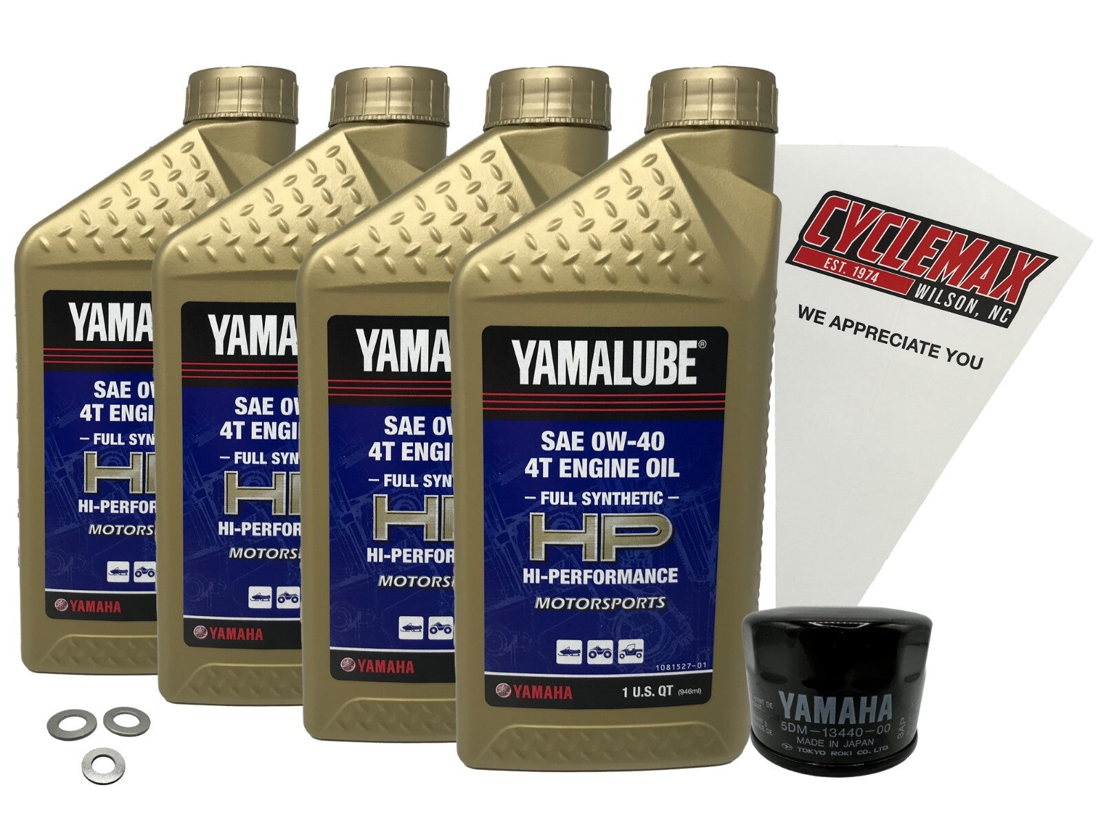 - CYCLEMAX OIL CHANGE KIT INCLUDES: Four Yamaha LUB-00W40-FS-12 Yamalube Full Synthetic 0W40 Quarts of Oil, One Yamaha 5DM-13440-00-00 Oil Filter, Two 6mm Drain Plug Crush Washers, One 10mm Drain Plug Crush Washer and a Convenient Disposable Funnel.
