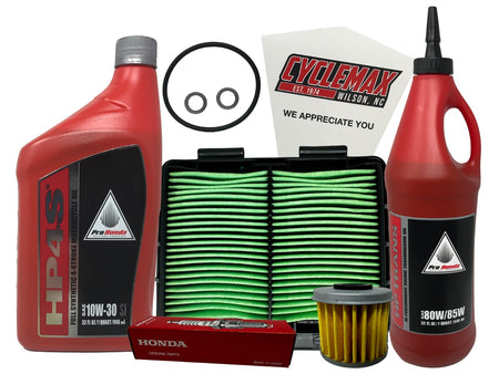 - CYCLEMAX OIL CHANGE KIT INCLUDES: One Honda 08C35-SYN HP4s Full Synthetic 10W40 Quart of Oil, One Honda 15412-MEN-671 Oil Filter, One Honda 17220-KZZ-900 Air Filter, One Honda 31908-KRN-A41 NGK R0451B-8 Spark Plug, One Honda 91302-PA9-003 Large O-Ring, One Honda 08C35-A851M01 Transmission Oil , Two 8mm Drain Plug Crush Washers and a Convenient Disposable Funnel.