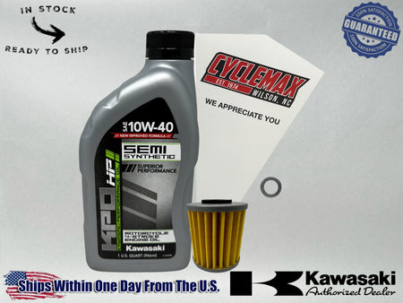- CYCLEMAX OIL CHANGE KIT INCLUDES: One Kawasaki K61021-300-01Q KPO Semi Synthetic 10W40 Motorcycle Quarts of Oil, One Kawasaki 52010-0001 Oil Filter, One 10mm Drain Plug Crush Washer and a Convenient Disposable Funnel.