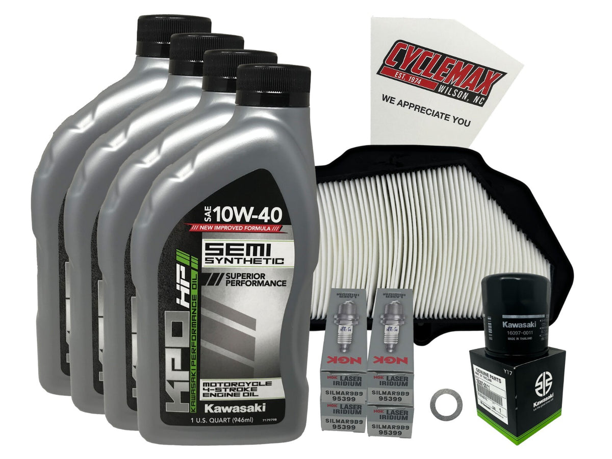 - CYCLEMAX TUNE UP KIT INCLUDES: Four Kawasaki K61021-300-01Q KPO Semi Synthetic 10W-40 Quarts of Oil, One Kawasaki 16097-0011 Oil Filter, One Kawasaki 11013-0757 Air Filter, Four SILMAR9B9 NGK Spark Plugs, One 12mm Drain Plug Crush Washer and a Convenient Disposable Funnel.