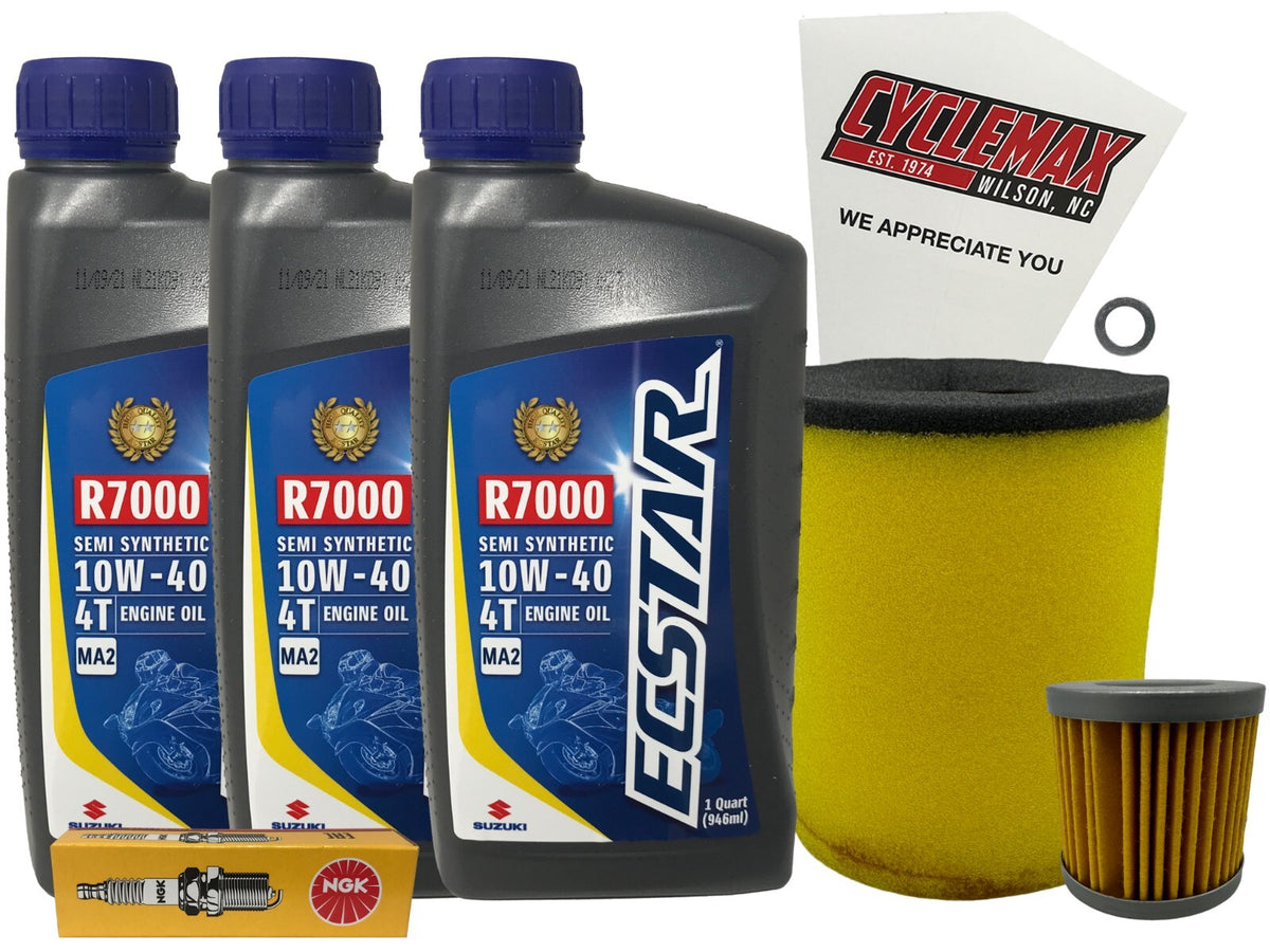 - CYCLEMAX OIL CHANGE KIT INCLUDES: Three Suzuki 990A0-01E30-01Q ECSTAR R7000 10W40 Quarts of Oil, One Suzuki 16510-29F00 Oil Filter, One Suzuki 13780-07G00 Air Filter, One CR7E NGK Spark Plug, One 12mm Drain Plug Crush Washer and a Convenient Disposable Funnel.