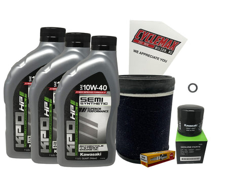 - CYCLEMAX TUNE UP KIT INCLUDES: Three Kawasaki K61021-300-01Q KPO Semi Synthetic 10W-40 Quarts of Oil, One Kawasaki 16097-0007 Oil Filter, One Kawasaki 11013-1292 Air Filter, One DPR8EA9 NGK Spark Plug, One 12mm Drain Plug Crush Washer and a Convenient Disposable Funnel.