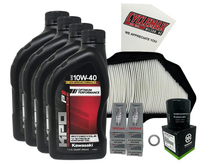- CYCLEMAX TUNE UP KIT INCLUDES: Four Kawasaki K61021-101-01Q KPO 10W-40 Quarts of Oil, One Kawasaki 16097-0011 Oil Filter, One Kawasaki 11013-0757 Air Filter, Four SILMAR9B9 NGK Spark Plugs, One 12mm Drain Plug Crush Washer and a Convenient Disposable Funnel.