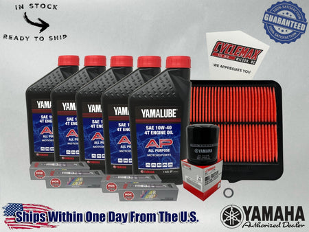 - CYCLEMAX OIL CHANGE KIT INCLUDES: Five Yamaha LUB-10w40-AP-12 Yamalube 10W40 Quarts of Oil, One Yamaha 5GH-13440-71-00 Oil Filter, One Yamaha 2S3-14451-01-00 Air Filter, Four CR9EIA-9 NGK Spark Plugs, One 14mm Drain Plug Crush Washer and a Convenient Disposable Funnel.