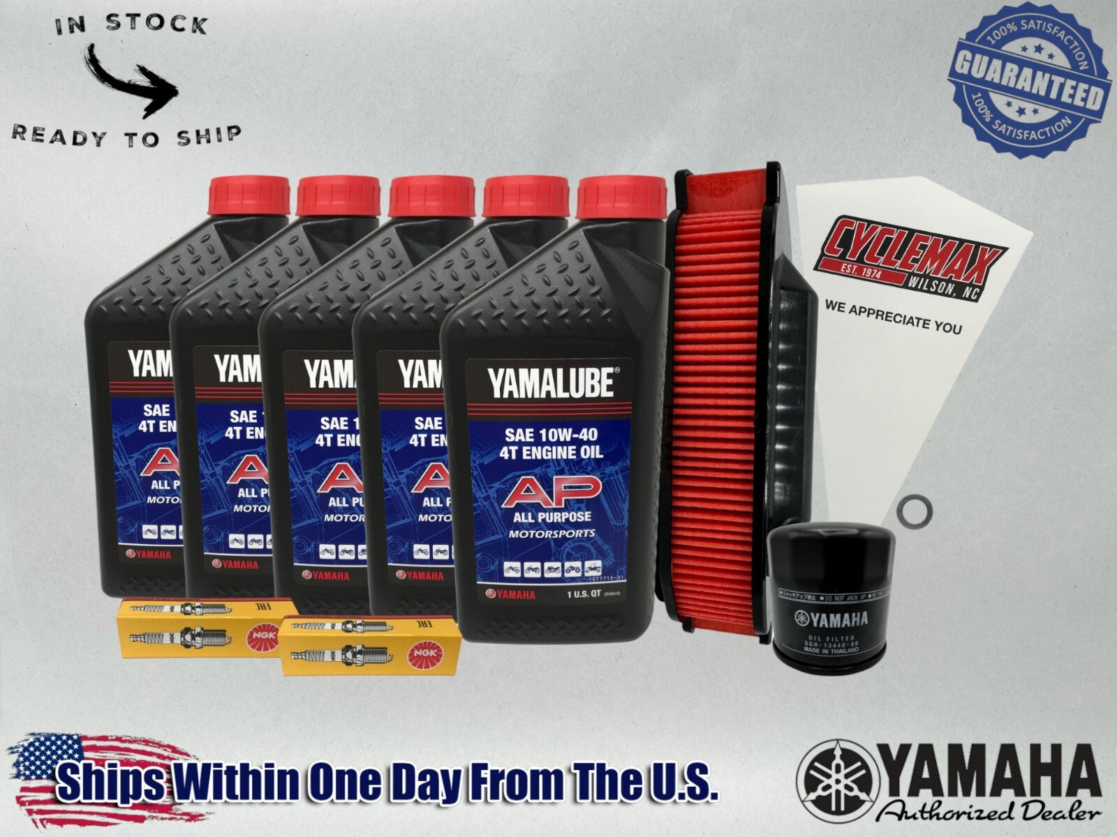 - CYCLEMAX OIL CHANGE KIT INCLUDES: Five Yamaha LUB-10w40-AP-12 Yamalube 10W40 Quarts of Oil, One Yamaha 5GH-13440-80-00 Oil Filter, One Yamaha 1TP-14451-00-00 Air Filter, Two CPR7EA NGK Spark Plugs, One 14mm Drain Plug Crush Washer and a Convenient Disposable Funnel.