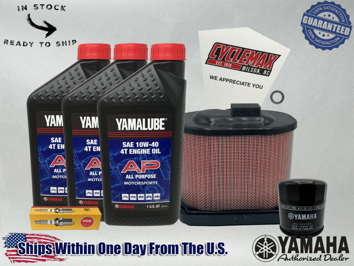 - CYCLEMAX OIL CHANGE KIT INCLUDES: Three Yamaha LUB-10w40-AP-12 Yamalube 10W40 Quarts of Oil, One Yamaha 5GH-13440-80-00 Oil Filter, One Yamaha 1WD-E4451-00-00 Air Filter, Two CR8E NGK Spark Plugs, One 12mm Drain Plug Crush Washer and a Convenient Disposable Funnel.