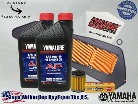 - CYCLEMAX OIL CHANGE KIT INCLUDES: Two Yamaha LUB-10W40-FS-12 Yamalube Full Synthetic 10W40 Quarts of Oil, One Yamaha 1S7-E3440-00-00 Oil Filter, One 12mm Drain Plug Crush Washer and a Convenient Disposable Funnel.